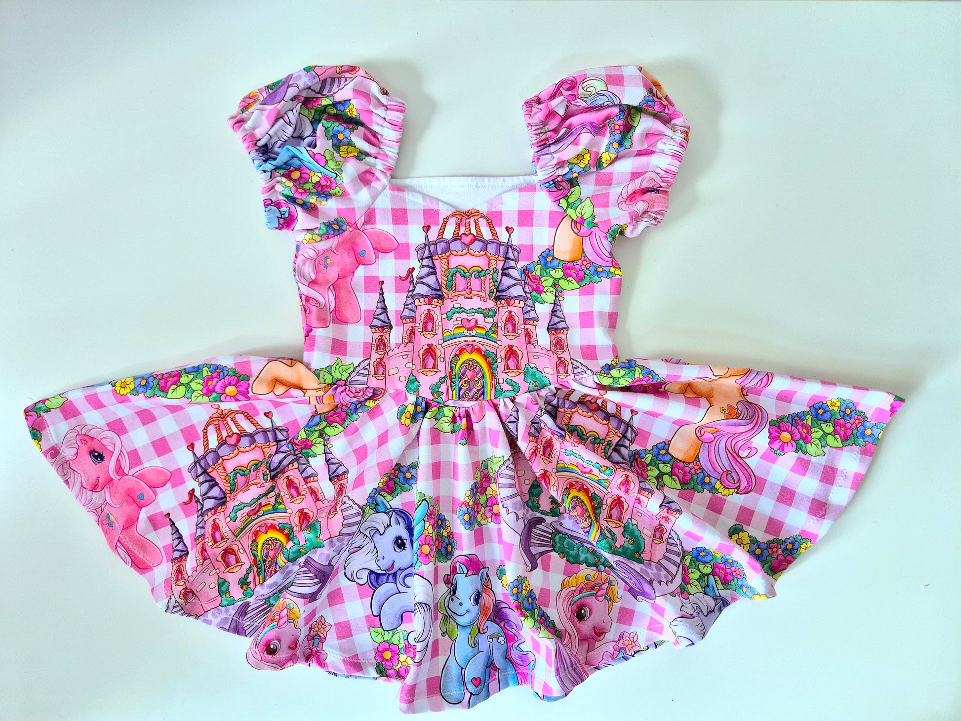 Step into a fairy-tale with this magical puff sleeve dress, featuring pastel ponies, whimsical castles, and sweet pink gingham. Perfect for twirls, parties, and everyday princess moments ✨