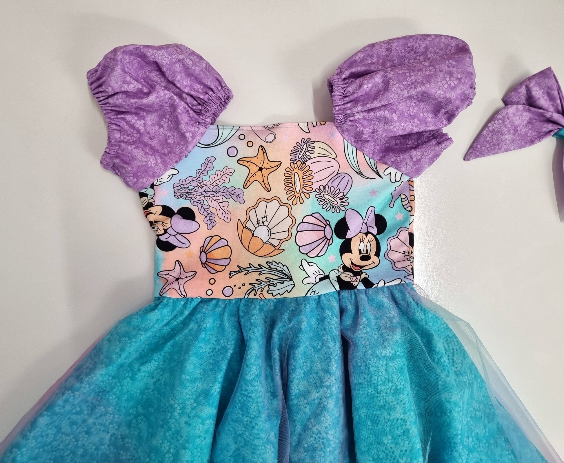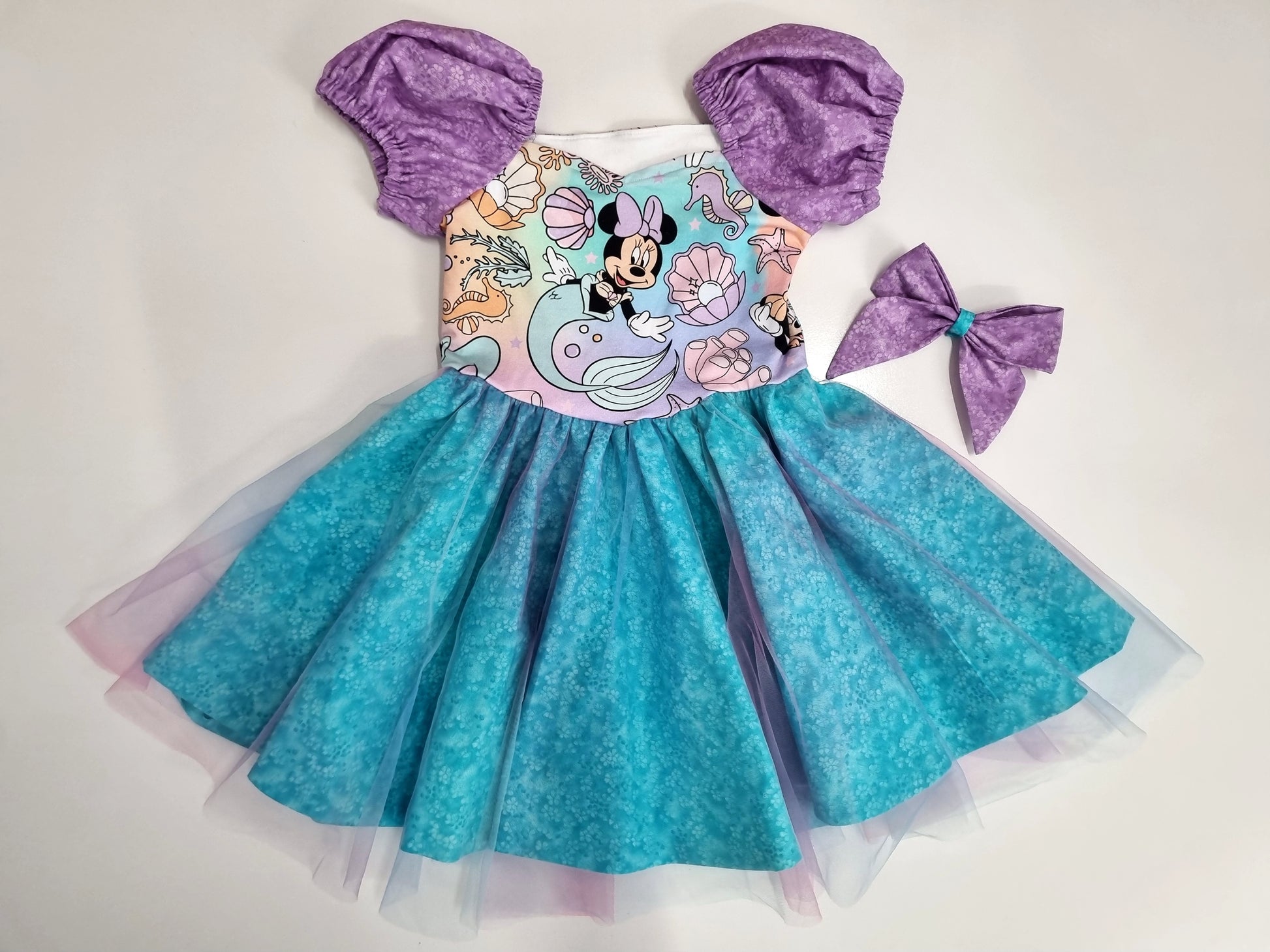 Bodice made from custom stretchy comfortable cotton lycra. Sleeves made from 100% cotton and skirt made from 100% cotton with tulle overlay.